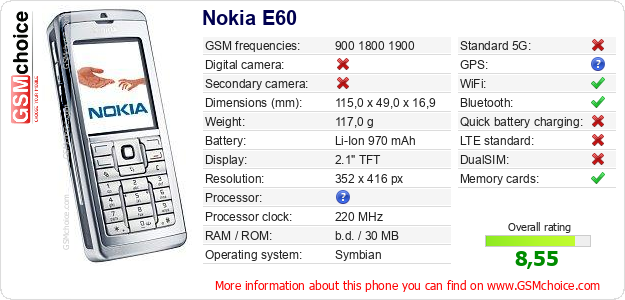 Do you have your website? Do you want to insert information about basic phone data of Nokia E60 somewhere? It is very easy. You can download the picture, or copy and paste the code below on the page:Pasting this code will display the following image: