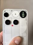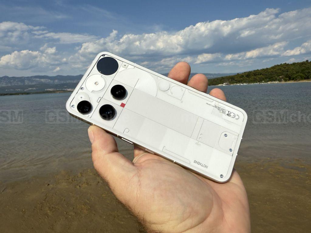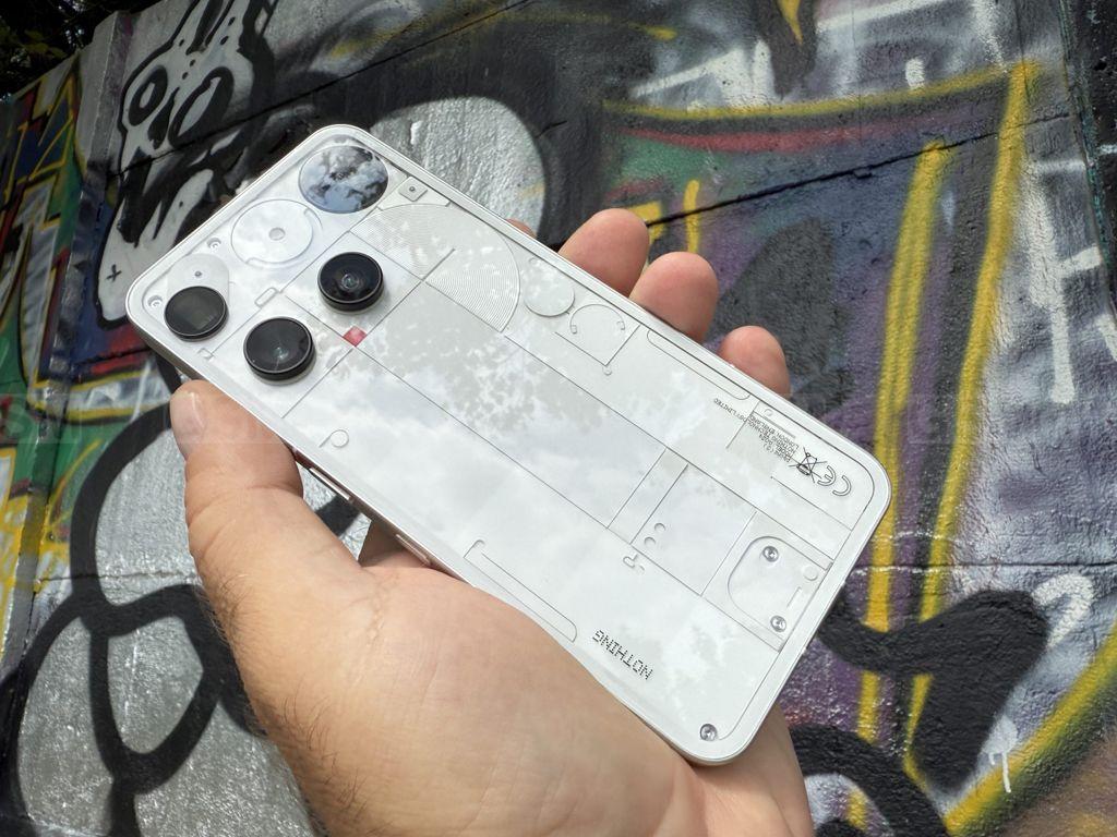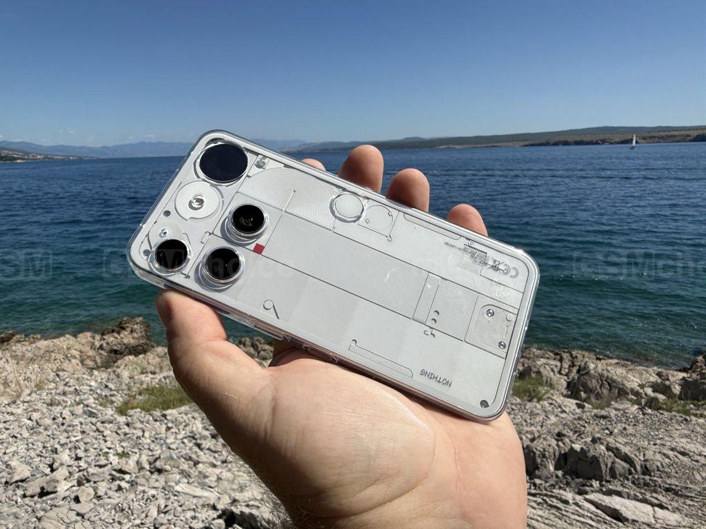 At first glance, it's hard not to notice the styling. It's unique, distinctive, and even strange. The smartphone stands out with a bold design that combines poetically scattered elements on the back panel, giving it a unique look and certainly unmistakable. Here you can see the white version. There are also other colours, but in my opinion, the white one looks the most impressive, as the imitation smartphone's innards are best visible through the transparent back. The panel itself is smooth, while the lenses protrude naturally. However, that's not the only surprise on the back panel. The device's rigidity is provided by a metal frame. The entire device is IP68-rated and truly premium.