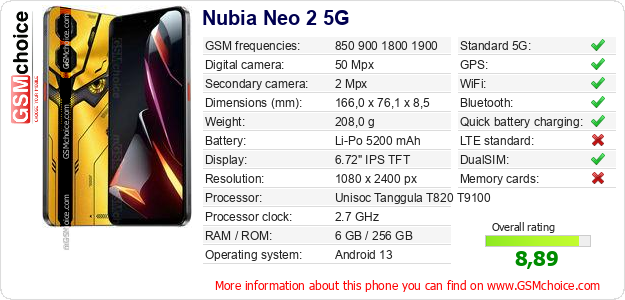 Do you have your website? Do you want to insert information about basic phone data of Nubia Neo 2 5G somewhere? It is very easy. You can download the picture, or copy and paste the code below on the page:Pasting this code will display the following image: