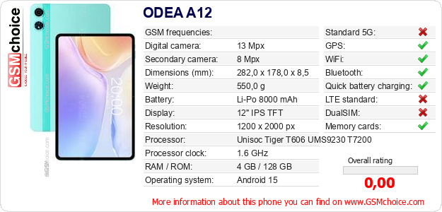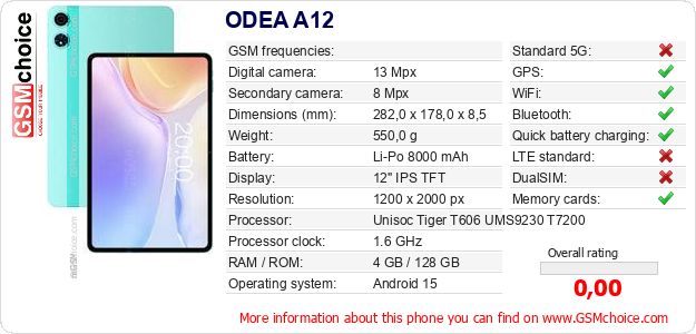 Do you have your website? Do you want to insert information about basic phone data of ODEA A12 somewhere? It is very easy. You can download the picture, or copy and paste the code below on the page:Pasting this code will display the following image: