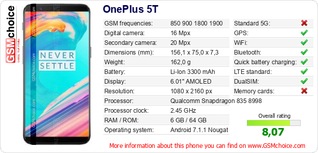 Do you have your website? Do you want to insert information about basic phone data of OnePlus 5T somewhere? It is very easy. You can download the picture, or copy and paste the code below on the page:Pasting this code will display the following image: