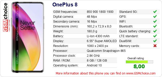 Do you have your website? Do you want to insert information about basic phone data of OnePlus 8 somewhere? It is very easy. You can download the picture, or copy and paste the code below on the page:Pasting this code will display the following image: