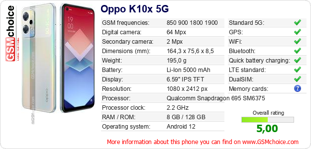 Do you have your website? Do you want to insert information about basic phone data of Oppo K10x 5G somewhere? It is very easy. You can download the picture, or copy and paste the code below on the page:Pasting this code will display the following image: