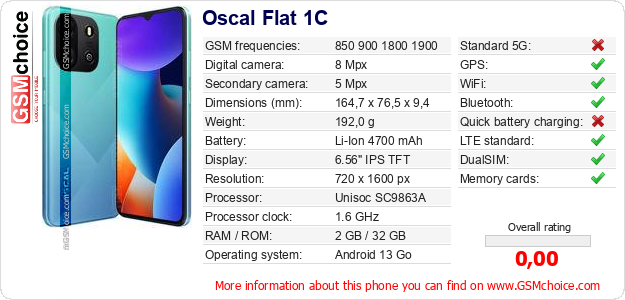Do you have your website? Do you want to insert information about basic phone data of Oscal Flat 1C somewhere? It is very easy. You can download the picture, or copy and paste the code below on the page:Pasting this code will display the following image:
