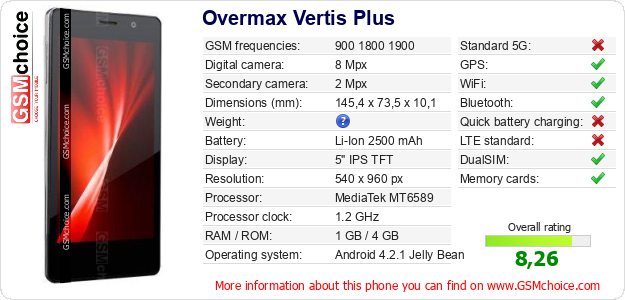 Do you have your website? Do you want to insert information about basic phone data of Overmax Vertis Plus somewhere? It is very easy. You can download the picture, or copy and paste the code below on the page:Pasting this code will display the following image: