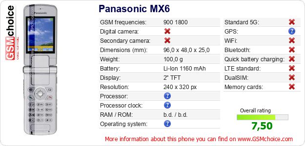 Do you have your website? Do you want to insert information about basic phone data of Panasonic MX6 somewhere? It is very easy. You can download the picture, or copy and paste the code below on the page:Pasting this code will display the following image: