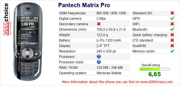 Do you have your website? Do you want to insert information about basic phone data of Pantech Matrix Pro somewhere? It is very easy. You can download the picture, or copy and paste the code below on the page:Pasting this code will display the following image: