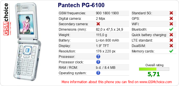 Do you have your website? Do you want to insert information about basic phone data of Pantech PG-6100 somewhere? It is very easy. You can download the picture, or copy and paste the code below on the page:Pasting this code will display the following image: