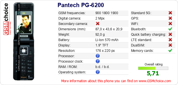Do you have your website? Do you want to insert information about basic phone data of Pantech PG-6200 somewhere? It is very easy. You can download the picture, or copy and paste the code below on the page:Pasting this code will display the following image: