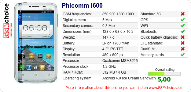 Do you have your website? Do you want to insert information about basic phone data of Phicomm i600 somewhere? It is very easy. You can download the picture, or copy and paste the code below on the page:Pasting this code will display the following image: