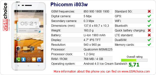 Do you have your website? Do you want to insert information about basic phone data of Phicomm i803w somewhere? It is very easy. You can download the picture, or copy and paste the code below on the page:Pasting this code will display the following image: