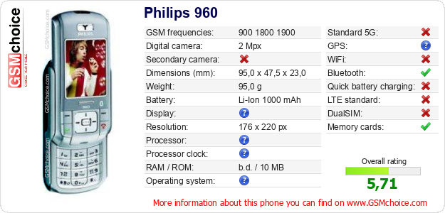 Do you have your website? Do you want to insert information about basic phone data of Philips 960 somewhere? It is very easy. You can download the picture, or copy and paste the code below on the page:Pasting this code will display the following image: