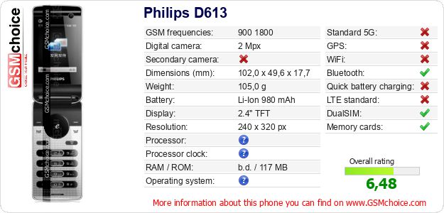 Do you have your website? Do you want to insert information about basic phone data of Philips D613 somewhere? It is very easy. You can download the picture, or copy and paste the code below on the page:Pasting this code will display the following image: