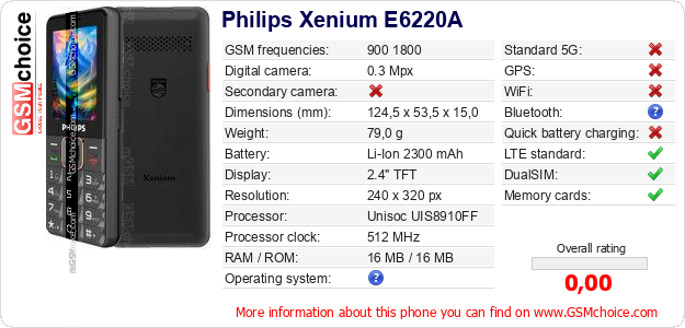 Do you have your website? Do you want to insert information about basic phone data of Philips Xenium E6220A somewhere? It is very easy. You can download the picture, or copy and paste the code below on the page:Pasting this code will display the following image: