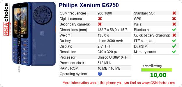 Do you have your website? Do you want to insert information about basic phone data of Philips Xenium E6250 somewhere? It is very easy. You can download the picture, or copy and paste the code below on the page:Pasting this code will display the following image:
