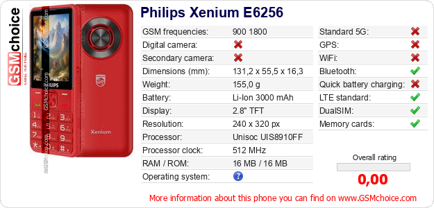 Do you have your website? Do you want to insert information about basic phone data of Philips Xenium E6256 somewhere? It is very easy. You can download the picture, or copy and paste the code below on the page:Pasting this code will display the following image: