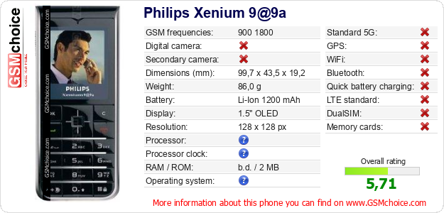 Do you have your website? Do you want to insert information about basic phone data of Philips Xenium 9@9a somewhere? It is very easy. You can download the picture, or copy and paste the code below on the page:Pasting this code will display the following image: