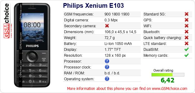Do you have your website? Do you want to insert information about basic phone data of Philips Xenium E103 somewhere? It is very easy. You can download the picture, or copy and paste the code below on the page:Pasting this code will display the following image: