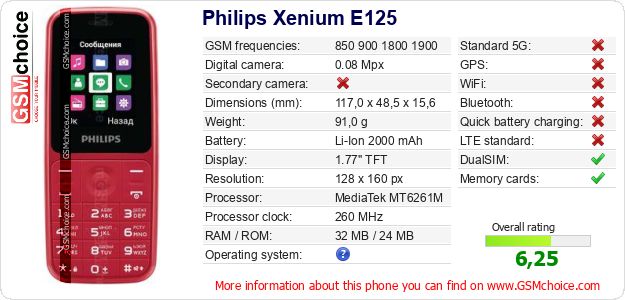 Do you have your website? Do you want to insert information about basic phone data of Philips Xenium E125 somewhere? It is very easy. You can download the picture, or copy and paste the code below on the page:Pasting this code will display the following image: