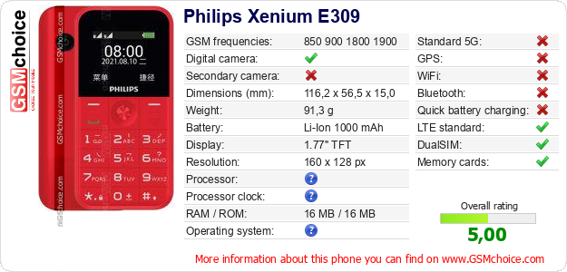 Do you have your website? Do you want to insert information about basic phone data of Philips Xenium E309 somewhere? It is very easy. You can download the picture, or copy and paste the code below on the page:Pasting this code will display the following image: