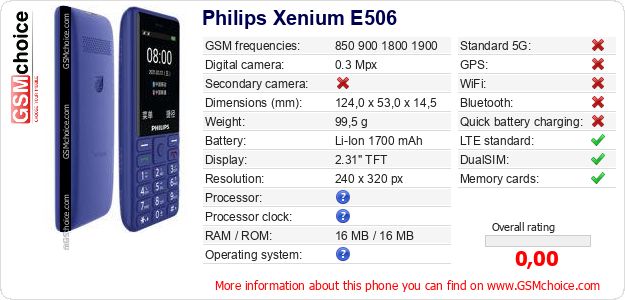 Do you have your website? Do you want to insert information about basic phone data of Philips Xenium E506 somewhere? It is very easy. You can download the picture, or copy and paste the code below on the page:Pasting this code will display the following image: