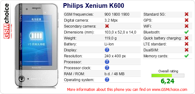 Do you have your website? Do you want to insert information about basic phone data of Philips Xenium K600 somewhere? It is very easy. You can download the picture, or copy and paste the code below on the page:Pasting this code will display the following image: