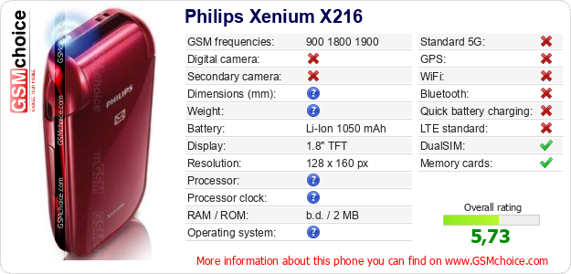 Do you have your website? Do you want to insert information about basic phone data of Philips Xenium X216 somewhere? It is very easy. You can download the picture, or copy and paste the code below on the page:Pasting this code will display the following image:
