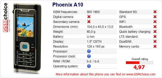 Do you have your website? Do you want to insert information about basic phone data of Phoenix A10 somewhere? It is very easy. You can download the picture, or copy and paste the code below on the page:Pasting this code will display the following image:
