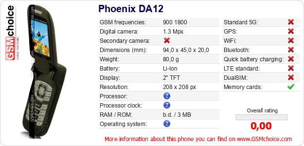Do you have your website? Do you want to insert information about basic phone data of Phoenix DA12 somewhere? It is very easy. You can download the picture, or copy and paste the code below on the page:Pasting this code will display the following image: