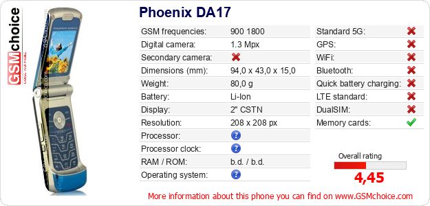 Do you have your website? Do you want to insert information about basic phone data of Phoenix DA17 somewhere? It is very easy. You can download the picture, or copy and paste the code below on the page:Pasting this code will display the following image: