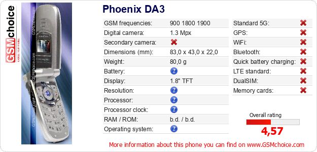 Do you have your website? Do you want to insert information about basic phone data of Phoenix DA3 somewhere? It is very easy. You can download the picture, or copy and paste the code below on the page:Pasting this code will display the following image: