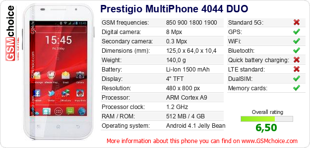 Do you have your website? Do you want to insert information about basic phone data of Prestigio MultiPhone 4044 DUO somewhere? It is very easy. You can download the picture, or copy and paste the code below on the page:Pasting this code will display the following image: