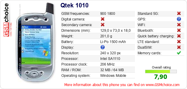 Do you have your website? Do you want to insert information about basic phone data of Qtek 1010 somewhere? It is very easy. You can download the picture, or copy and paste the code below on the page:Pasting this code will display the following image: