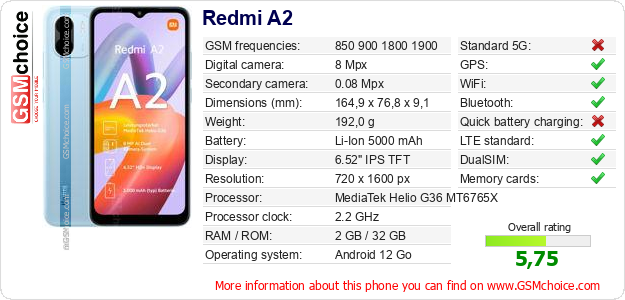 Do you have your website? Do you want to insert information about basic phone data of Redmi A2 somewhere? It is very easy. You can download the picture, or copy and paste the code below on the page:Pasting this code will display the following image: