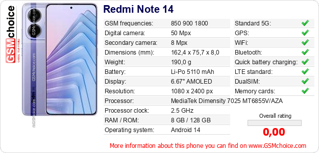 Do you have your website? Do you want to insert information about basic phone data of Redmi Note 14 somewhere? It is very easy. You can download the picture, or copy and paste the code below on the page:Pasting this code will display the following image: