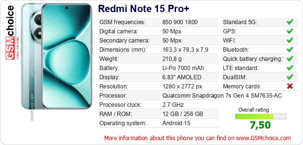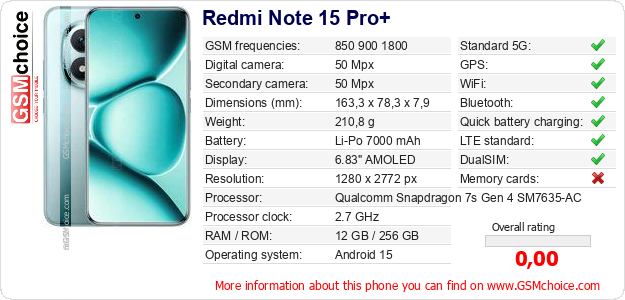 Do you have your website? Do you want to insert information about basic phone data of Redmi Note 15 Pro+ somewhere? It is very easy. You can download the picture, or copy and paste the code below on the page:Pasting this code will display the following image:
