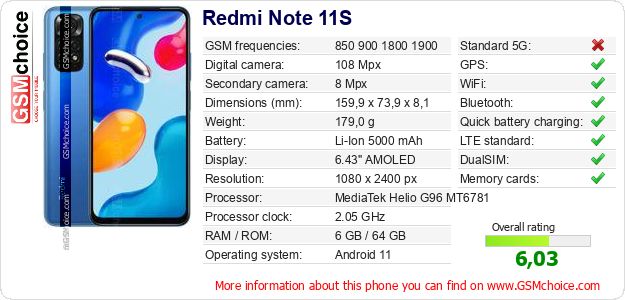 Do you have your website? Do you want to insert information about basic phone data of Redmi Note 11S somewhere? It is very easy. You can download the picture, or copy and paste the code below on the page:Pasting this code will display the following image: