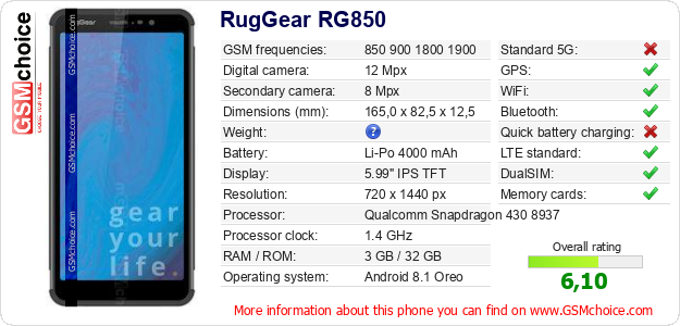 Do you have your website? Do you want to insert information about basic phone data of RugGear RG850 somewhere? It is very easy. You can download the picture, or copy and paste the code below on the page:Pasting this code will display the following image: