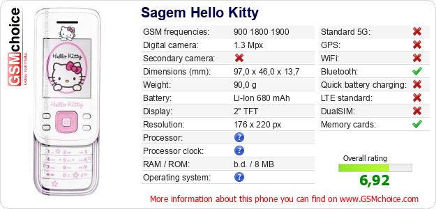 Do you have your website? Do you want to insert information about basic phone data of Sagem Hello Kitty somewhere? It is very easy. You can download the picture, or copy and paste the code below on the page:Pasting this code will display the following image: