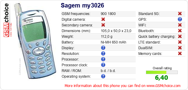 Do you have your website? Do you want to insert information about basic phone data of Sagem my3026 somewhere? It is very easy. You can download the picture, or copy and paste the code below on the page:Pasting this code will display the following image: