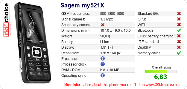 Do you have your website? Do you want to insert information about basic phone data of Sagem my521X somewhere? It is very easy. You can download the picture, or copy and paste the code below on the page:Pasting this code will display the following image: