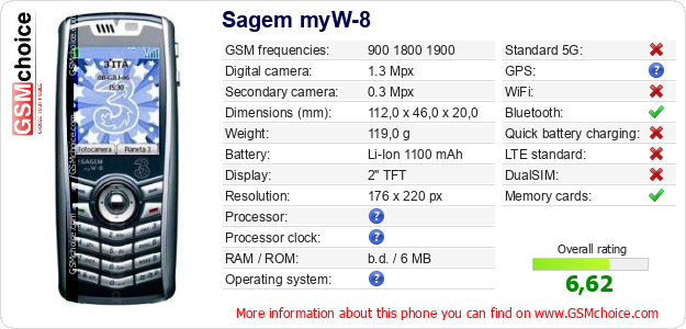Do you have your website? Do you want to insert information about basic phone data of Sagem myW-8 somewhere? It is very easy. You can download the picture, or copy and paste the code below on the page:Pasting this code will display the following image: