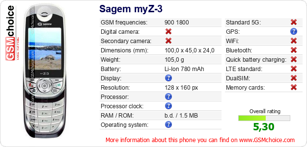 Do you have your website? Do you want to insert information about basic phone data of Sagem myZ-3 somewhere? It is very easy. You can download the picture, or copy and paste the code below on the page:Pasting this code will display the following image: