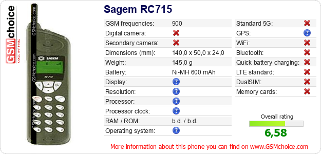 Do you have your website? Do you want to insert information about basic phone data of Sagem RC715 somewhere? It is very easy. You can download the picture, or copy and paste the code below on the page:Pasting this code will display the following image: