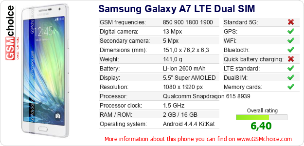 Do you have your website? Do you want to insert information about basic phone data of Samsung Galaxy A7 LTE Dual SIM somewhere? It is very easy. You can download the picture, or copy and paste the code below on the page:Pasting this code will display the following image: