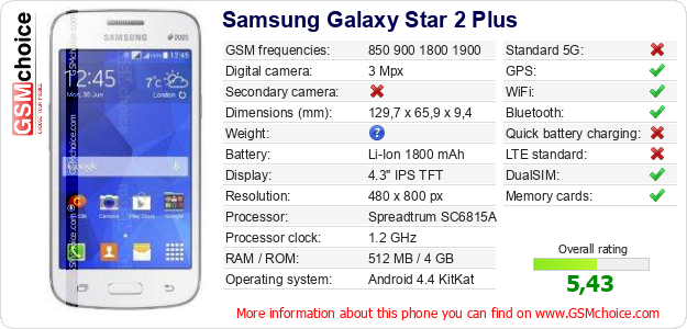 Do you have your website? Do you want to insert information about basic phone data of Samsung Galaxy Star 2 Plus somewhere? It is very easy. You can download the picture, or copy and paste the code below on the page:Pasting this code will display the following image:
