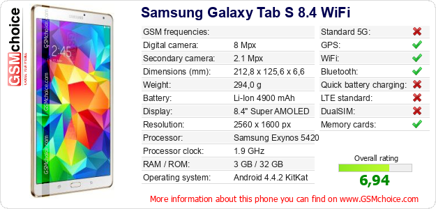 Do you have your website? Do you want to insert information about basic phone data of Samsung Galaxy Tab S 8.4 WiFi somewhere? It is very easy. You can download the picture, or copy and paste the code below on the page:Pasting this code will display the following image: