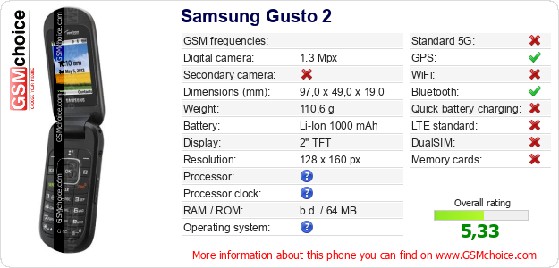Do you have your website? Do you want to insert information about basic phone data of Samsung Gusto 2 somewhere? It is very easy. You can download the picture, or copy and paste the code below on the page:Pasting this code will display the following image: