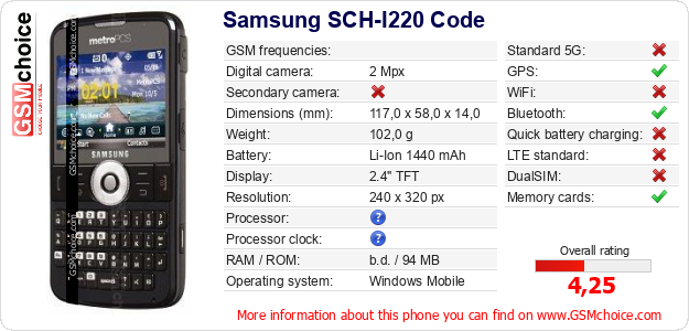 Do you have your website? Do you want to insert information about basic phone data of Samsung SCH-I220 Code somewhere? It is very easy. You can download the picture, or copy and paste the code below on the page:Pasting this code will display the following image: