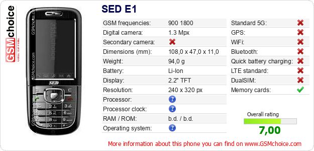 Do you have your website? Do you want to insert information about basic phone data of SED E1 somewhere? It is very easy. You can download the picture, or copy and paste the code below on the page:Pasting this code will display the following image: